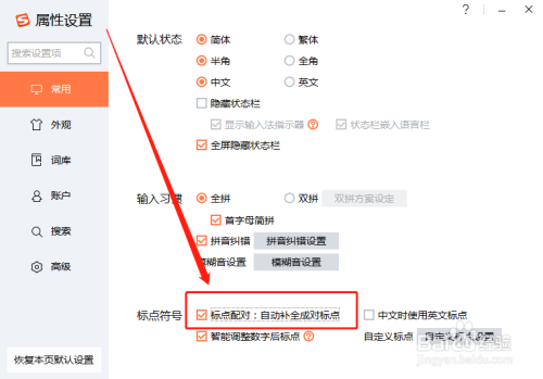 最后在打开的常用选项页面下方点击“标点配对:主动补全当作对标点”选项,然后封闭该窗口即可实现输入标点符号主动补全当作对。