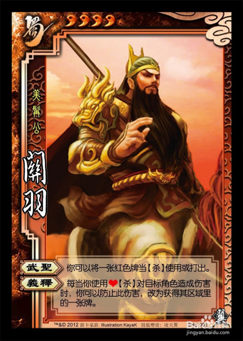 2.武将牌。抽取完身份牌后,大师抽取本身的武将牌一张。武将牌多种多样,每一张牌上面都标注了武将的来历国、血量、技术。大师自行阅读与堆集,方能把握武将的弄法。以关羽为例:关羽、蜀国、四血、技术是下面一大串的文字。