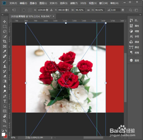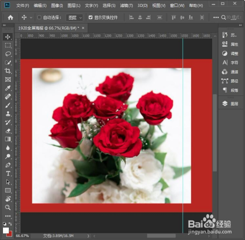 接下来,我们把前景设置为白色,点击【矩形东西】在右边画出一个外形,一会放图片用。外形可以超出右边的参考线多一点点,如图所示。