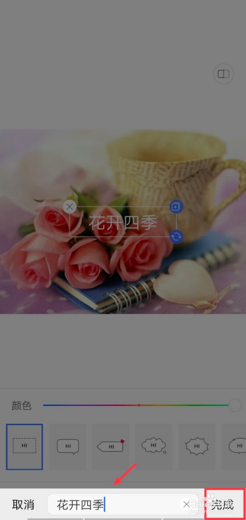 点击图片上的虚拟方框,呈现输入键盘,我们输入要添加的文字,然后点击”完当作“按钮,如下图所示。