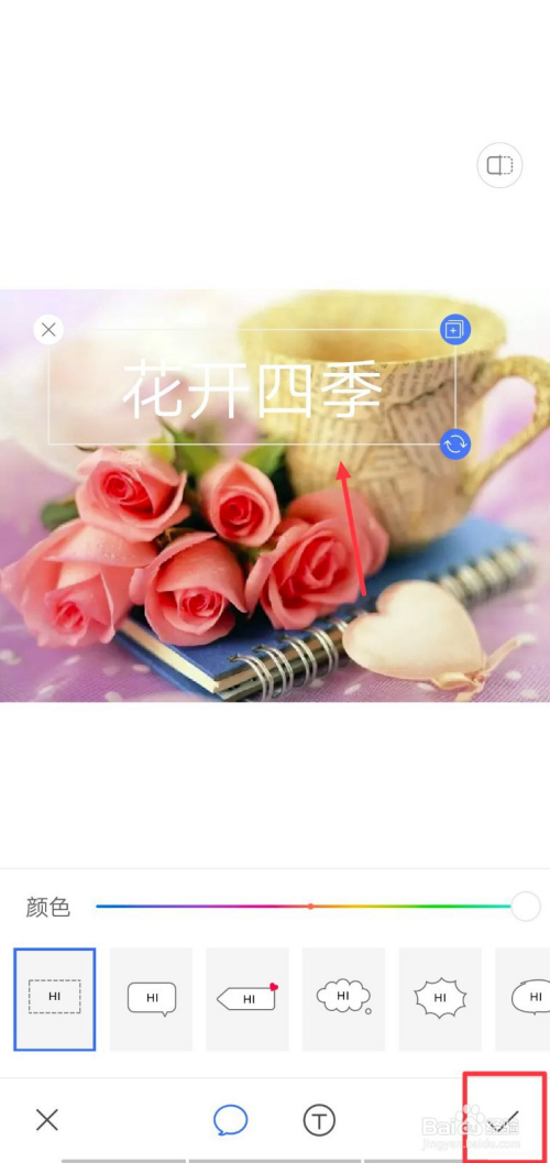 调节方框位置和大小,字体味跟着边框的大小而变大或变小,调整完当作后,我们点击下面的”V“按钮,如下图所示。