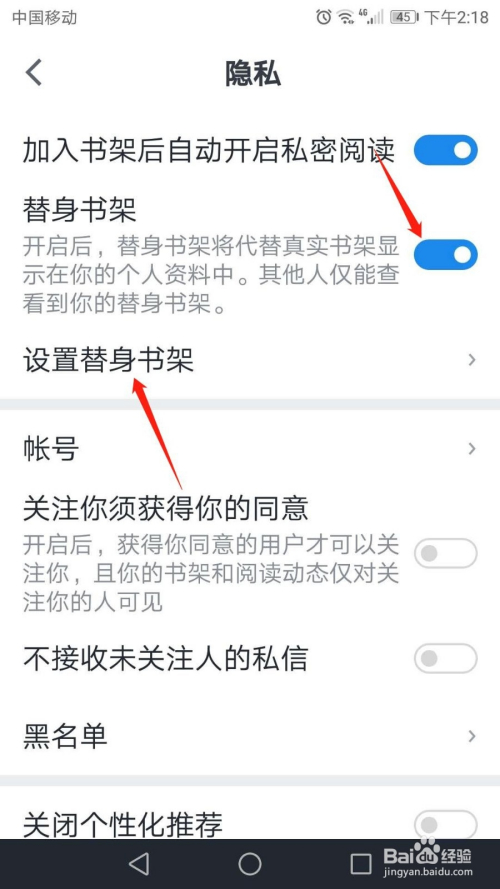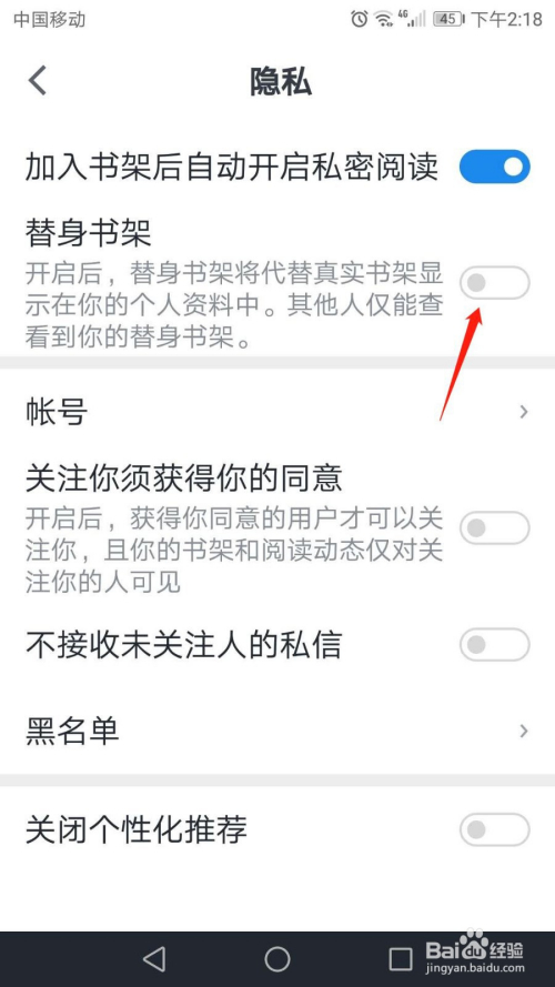 在“隐私”页面,点击“替身书架”灰色开关。