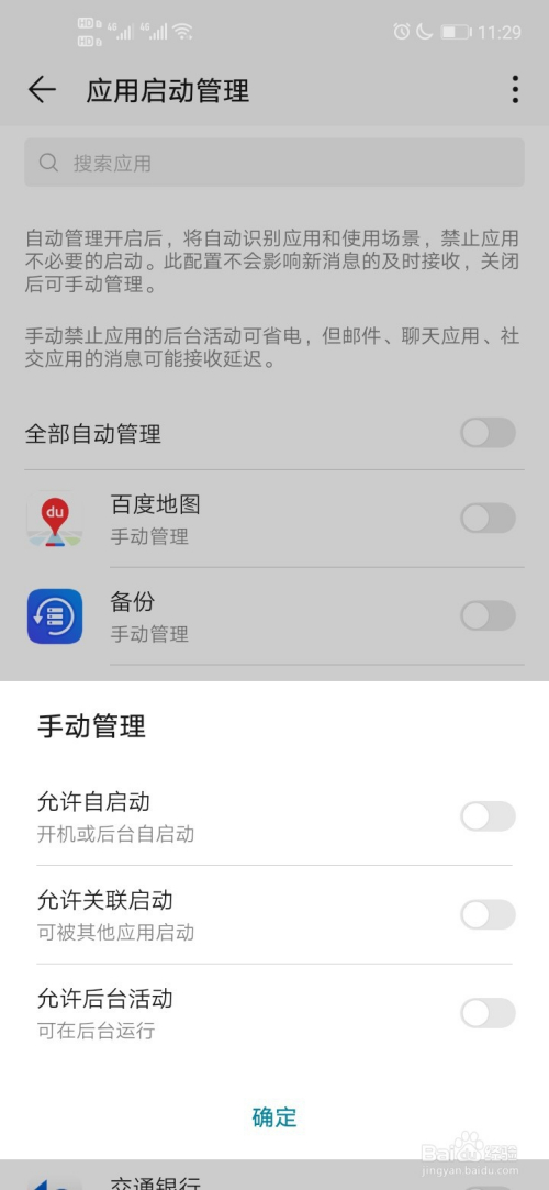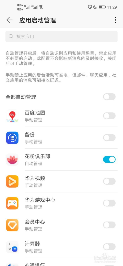 点击“应用启动办理”,找到不需要自启动的应用如“花粉俱乐部”,点击右侧封闭按钮,在弹出窗口点“确定”。