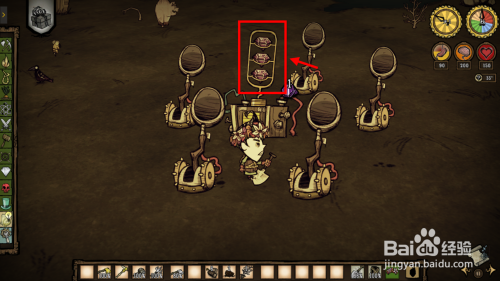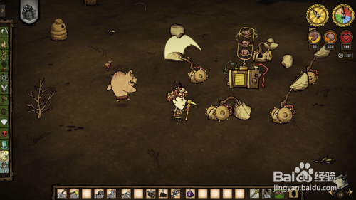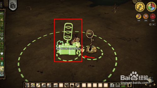 利用菲诺娜进入饥荒宿世界中,建造1台投石机放在地面上。