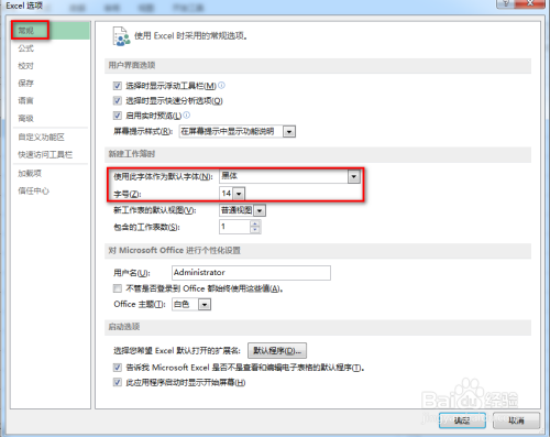 然后弹出一个对话框,点击左侧的菜单项“常规”,在呈现的右侧界面中,将”利用此字体作为默认字体“设置为:黑体,同时可将”字号“设置为:14,最后点击“确定”,具体如下图所示:
