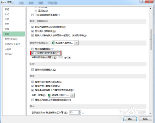 然后,弹出一个对话框,点击左侧的菜单项“高级”,在呈现的右侧界面中,勾选“不压缩文件中的图像”,最后点击“确定”,具体如下图所示:
