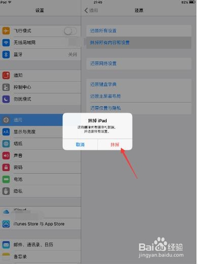 当弹出”抹失落iPAD“提醒时,点”抹失落“即可将IPAD恢复到出厂设置。