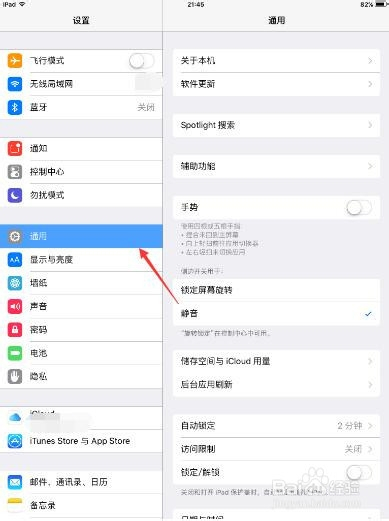 在IPAD设置界面,找到”通用“,点击进入通用设置界面。