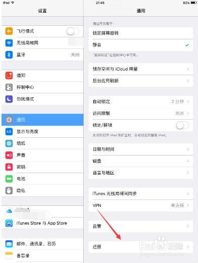 在通用设置界面,将菜单标的目的下拉,找到”还原“菜单,点击进入还原界面。