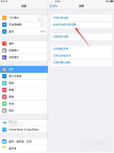 在还原界面,找到”抹失落所有内容和设置“,点击将IPAD恢复到默认设置。