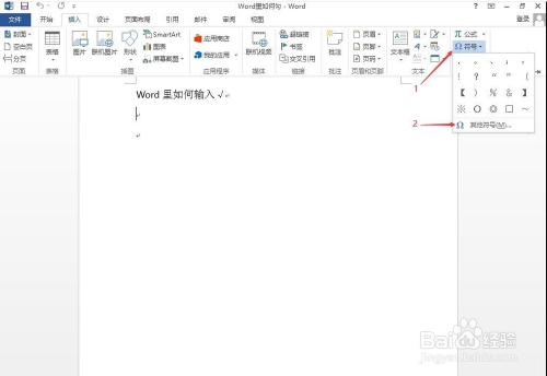 或在符号对话框里点击字体后面的小三角符号,在弹出列表中选择“Windings 2”,然后找到“√”选定,点击插入。
