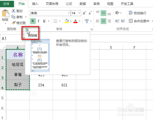 首先鼠标选中第一列数据,并利用Ctrl+C进行复制,然后在“起头”选项卡中,点击“剪贴板”旁的斜箭头,具体如下图所示: