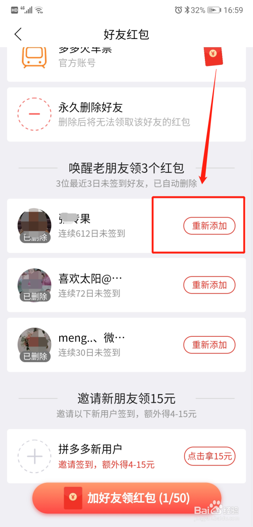 点击“红包老友”下拉查看已删除老友,点击老友后方“从头添加”
