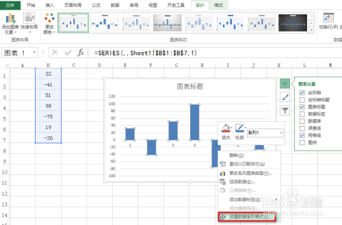 选中该柱状图中的一个柱形,然后鼠标右键,在呈现的下拉菜单中,点击“设置数据系列格局”,具体如下图所示: