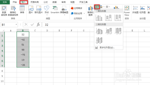 首先,全数选中该数据区域,在”插入“选项卡下找到并点击“插入柱形图”右侧的小三角,在呈现的菜单选中,点击一种柱形图模式,具体如下图所示: