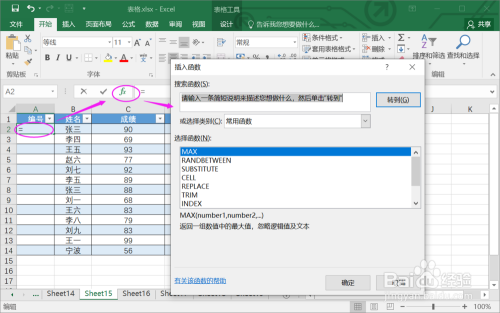 2.点击编号列,选择插入函数。