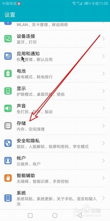 然后在打开的设置页面,点击存储的菜单项。