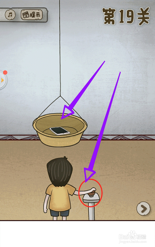 第19关,点击按钮会下降一个盆,不要让盆失落在地上,再点击一次,会遏制,拿到游戏机。