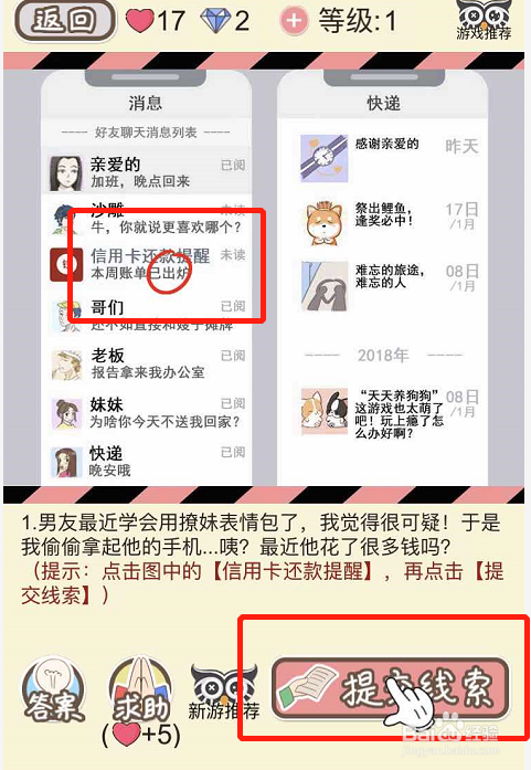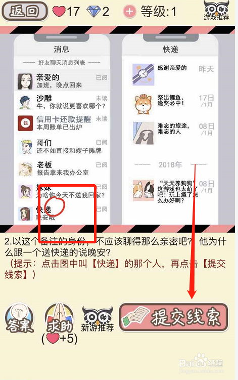 然后剧情提醒我们男友和一个备注是快递员的人聊天很是亲密,快递员是一个很是主要的信息,所以我们就要在上面的聊天记实中找到快递员,然后提交线索。