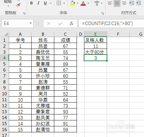 在单位格输入公式=COUNTIF(C2:C16,">80")然后按下enter即可完当作。