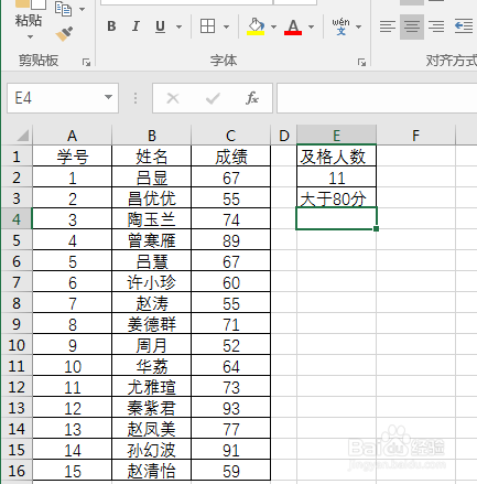 在E2单位格输入公式=COUNTIF(C2:C15,">=60"),然后按下enter键即可得出合格人数为11.