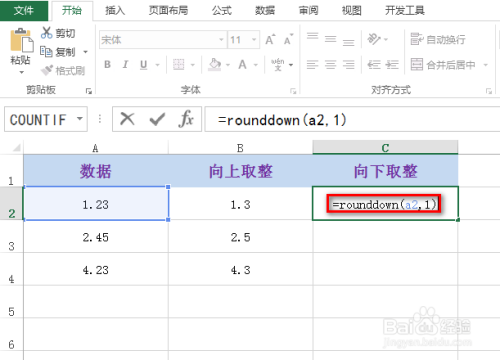 ”标的目的下取整“其道理”标的目的上取整“,同样是先输入公式:=rounddown(a2,1),具体如下图所示: