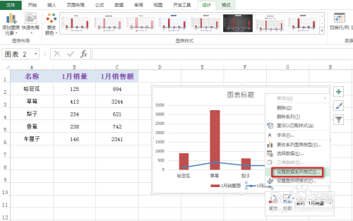 接着,继续点击并选中柱形图下面的“1月销量”,然后鼠标右键,在呈现的下拉菜单中,选择“设置数据系列格局”,具体如下图所示: