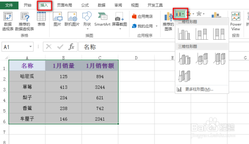 首先全数选中表格区域(包罗题目),在”插入“选项卡下找到并点击”插入柱形图“右侧的小三角,在呈现的下拉菜单中,点击一种”二维柱形图“模子,具体如下图所示: