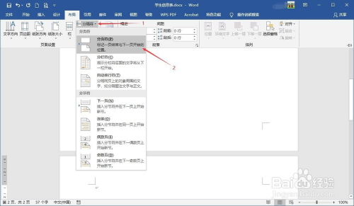 点击页面设置东西栏里的“分隔符”,在弹出菜单中选择“分页符”实此刻当前光标处新页的插入。