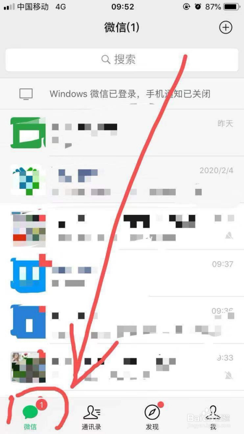 点击打开的微信App应用页面左下角“微信”选项,然后点击该页面上方的搜索框。