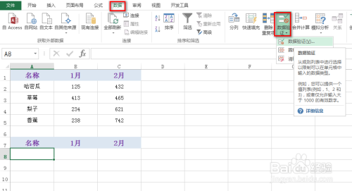 复制上述数据区域的题目到新的单位格中,然后选中一个空白单位格,接着在”数据“选项卡下找到并点击”数据验证“下方的小三角,在呈现的下拉菜单中,点击”数据验证“,具体如下图所示: