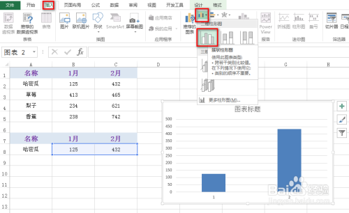 选中上述步调4生当作了数据值的所有单位格,在”插入“选项卡下找到并点击”插入柱形图“右侧的小三角,在呈现的下拉菜单中,选中一个柱形图显示模式,就能看到名称为”哈密瓜“的物品对应的1月以及2月的销量柱形图显示出来了,具体如下图所示: