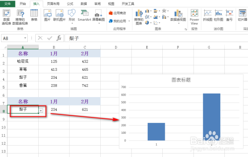 对单位格A8包含的名称进行选择,好比选中:梨子,右侧的柱形图就能主动显示该名称对应的1月以及2月的销量,结果如下图所示:
