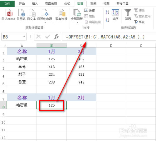 然后再选中一个单位格,并输入公式:”=offset(B1:C1,match(A8,A2:A5,),)“,按下Enter键,就会生当作一个数据值,再次选中该单位格,并鼠标标的目的右拉,主动填充后面的单位格,具体如下图所示: