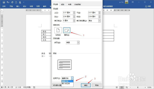 在页面设置对话框中,将纸张偏向点窜为横标的目的,应用于后面可以设置规模(默认环境是整篇文档),然后点击确认后文档设置为横标的目的。