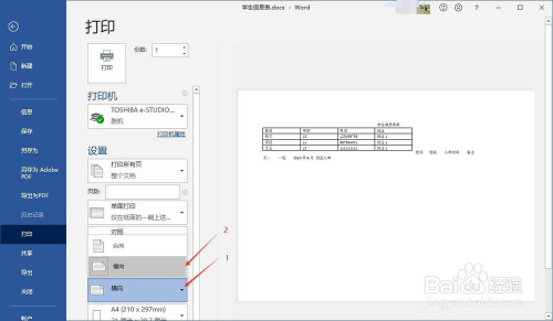 在打印界面找到“纵标的目的”,点击其右边的小三角图标,将其点窜为“横标的目的”。默认环境下Word文档是纵标的目的。