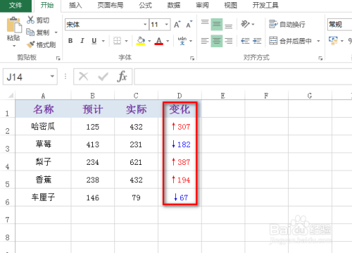 如下图为原始数据表格,此中,要将“转变”列的数据利用附带上涨与下降箭头的特别形式显示出来。