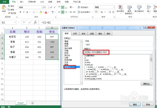 在弹出的对话框中,选择”自界说“,在”类型“中输入:”[红色][>0]↑0;[蓝色][<0]↓0“,最后点击”确定“,具体如下图所示: