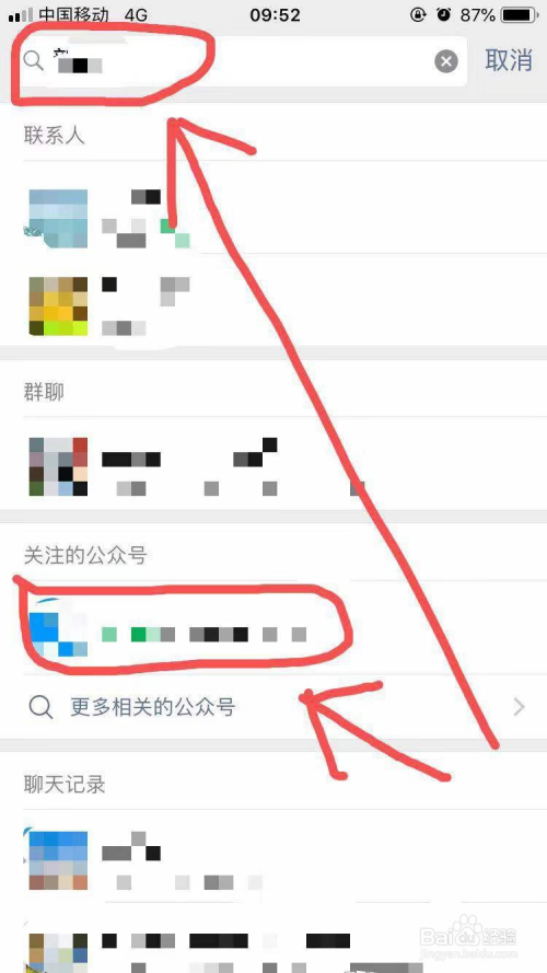 3.然后点击该页面上方的搜索框,输入需要清空所接收到的内容的微信公家号名称或名称中的关头字,搜刮找到需要清空所接收到的内容的微信公家号,并点击打开。