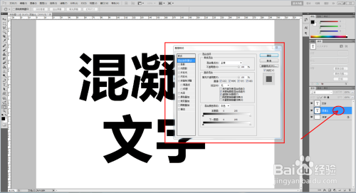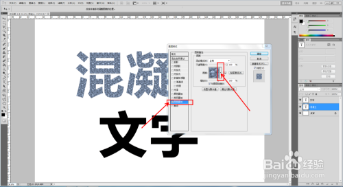 双击图示文字图层,弹出图层样式设置栏。勾选【图案叠加】,点击图示小三角,弹出图案选项栏;
