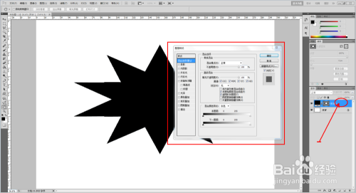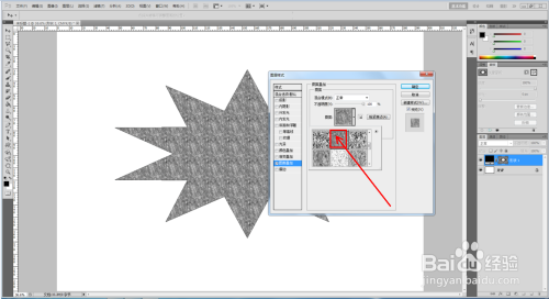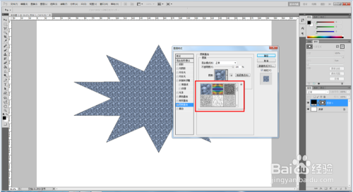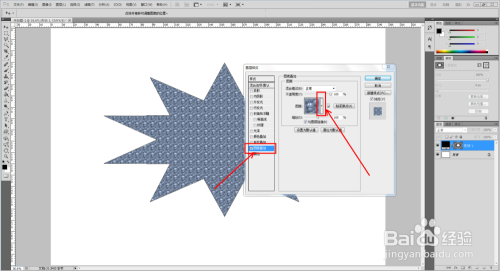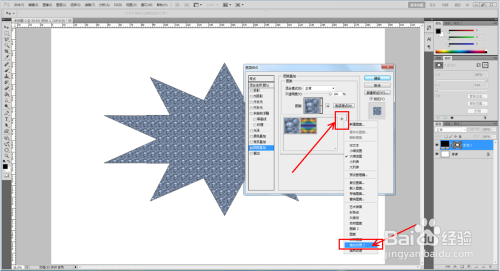 双击图示自界说图案图层,弹出图层样式设置栏。勾选【图案叠加】,点击图示小三角,弹出图案选项栏;