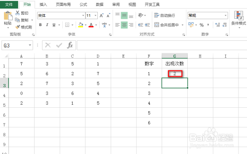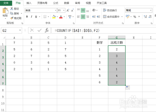 在“呈现次数”列下选中第一个空白的单位格,并输入公式:=COUNTIF($A$1:$D$5,F2),具体如下图所示: