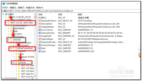 4.找到如下路径:计较机\HKEY_LOCAL_MACHINE\SYSTEM\CurrentControlSet\Services\wscsvc