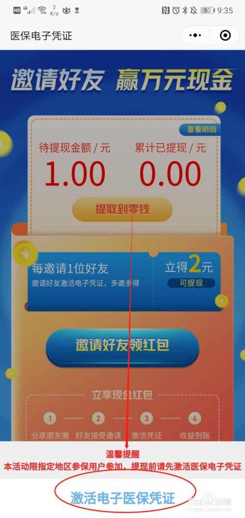 6.提取奖金到零钱,提醒激活电子医保凭证。