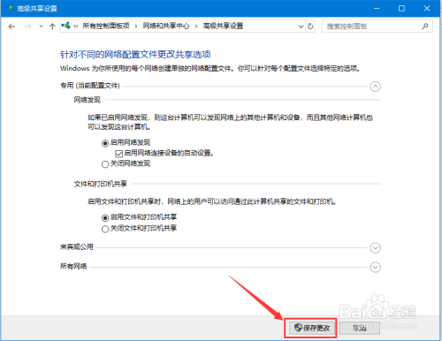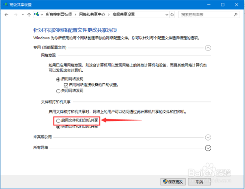 在“高级共享设置”页面专用(当前设置装备摆设文件)下,点击“启用文件和打印机共享”前的圆圈,使圈内有个黑色的小圆即可。见下图