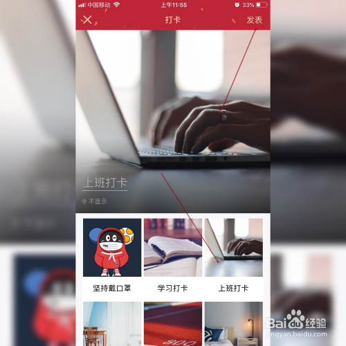 第四步,选择想要进行打卡的体例,点击图片之后,再次点击右上角的颁发选项