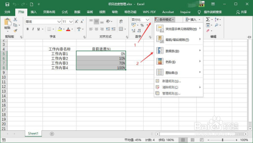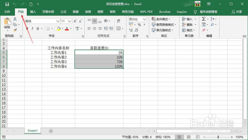 显示进度条的单位格的值应是百分比的值,选中需显示为进度条的单位格,点击Excel起头显示起头东西栏。