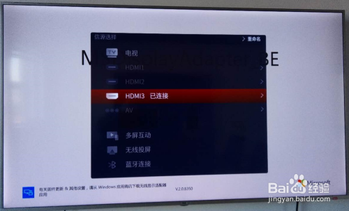 打开电视,点击遥控板带三根横杠的黄色按钮,进行“信源选择”,选择已毗连的“HDMI3”,点击确定。