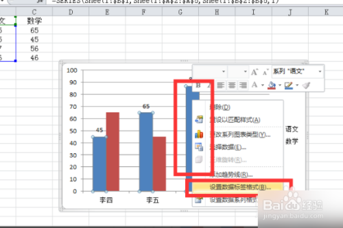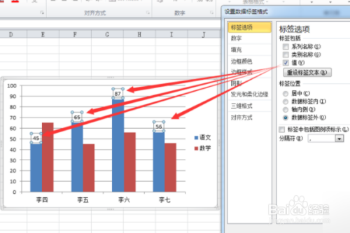 设置数学的数据标签就是红柱的数据标签方式同上。