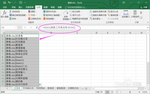 3.在A1输入公式【=INDEX(提取工作表名称,ROW())】。经由过程这个公式,挪用上一步新建的名称,获取到EXCEL的所有工作表名称。